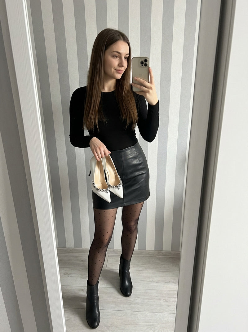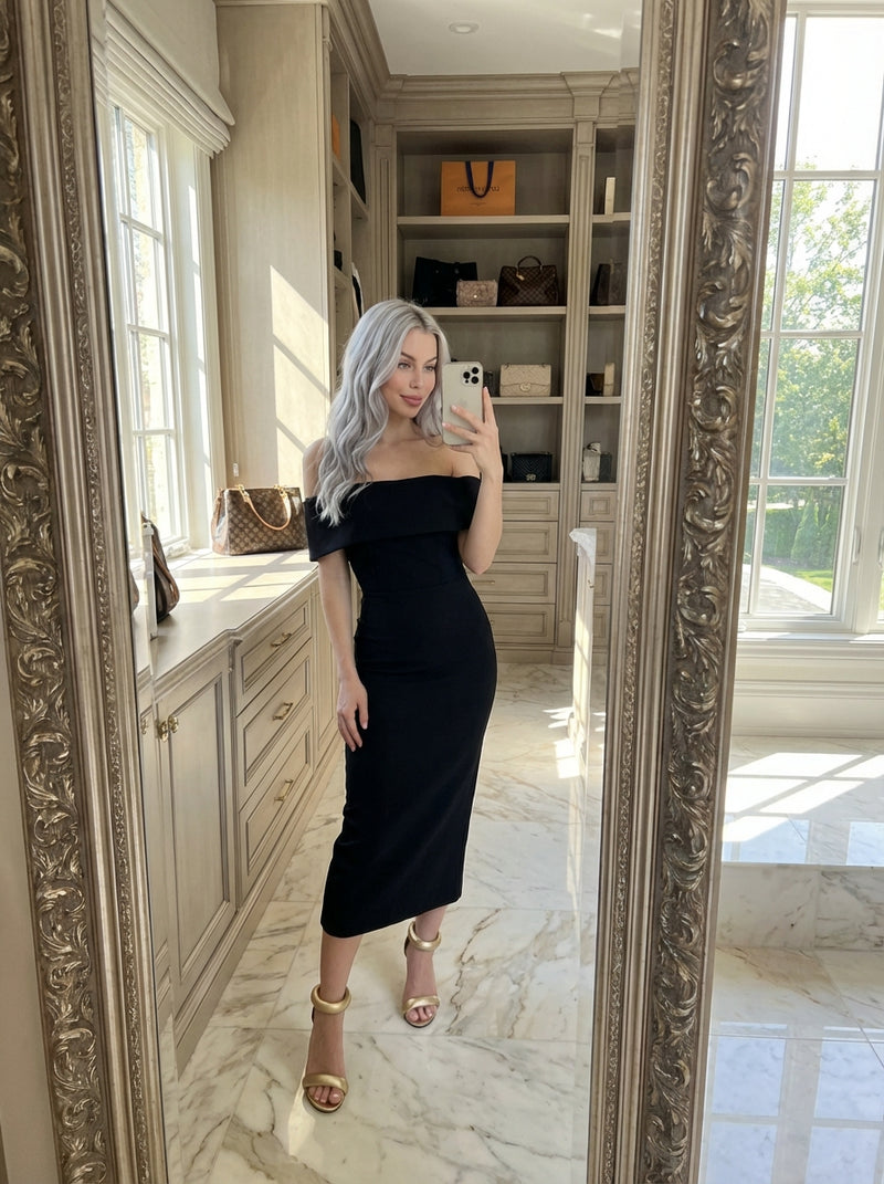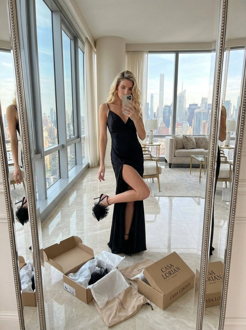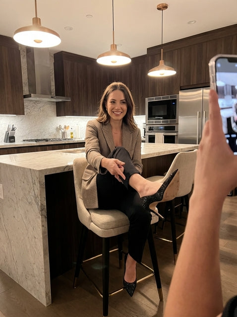She enters with a poise that feels controlled.